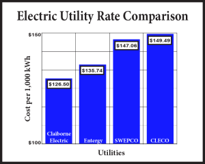 In December, Claiborne Electric members using an average of 1,000 kWh per month were billed $126.50. In comparison, the same bill would be $135.74 for an Entergy customer, $147.06 for a SWEPCO customer, and $149.49 for a CLECO customer.